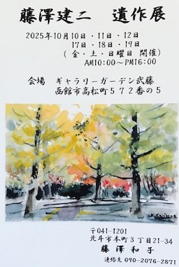 今日から藤澤健二遺作展が始まりました。懐かしい作品や赤光社展では見ることの出来なかった様々な作品が展示されていました。お土産に作品の絵ハガキを頂きました。2025年10月10日 東 誠投稿